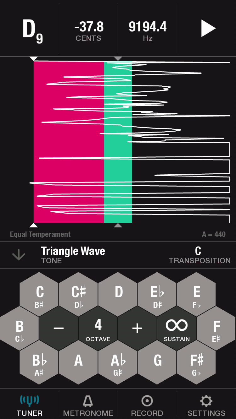 TUNABLE – a great metronome, tuning and recording app all-in one. It features a modern, appealing design and each element is easy to set up. The tuner shows a range of green and pink for indicating the more or less exact pitch, and also shows, in the top bar, the difference in cents, as well as the pitch measure in Hertz. The metronome offers the option of selecting number of beats per measure and subdivisions. And at the bottom of the screen, it also shows the standard tempo markings and the possibility to select those. Maybe the most interesting option here is the recorder, very simple, one button and one cursor for reverber, but it has the option of sharing the recording just with a click. You can send your music by email, to Soundcloud, to your music library or through any other compatible app on your phone, including text message and Whatt’sApp.