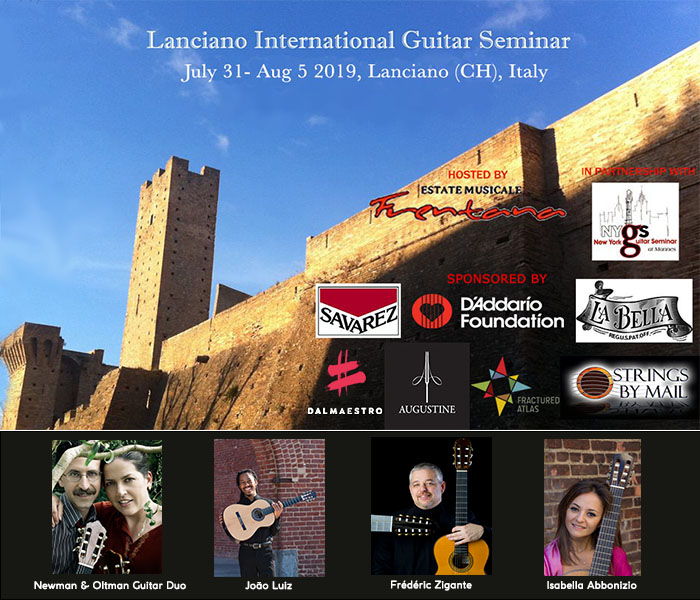 We’re ready for another incredible experience in Italy with the Lanciano International Guitar Seminar, this year at its 7th edition. The event will take place from July 31 and August 5 and will feature among the faculty two big names in classical guitar from the two continents, Europe and the US: Frédéric Zigante and Joao Luiz (Brasil Guitar Duo). Permanent faculty are Michael Newman and Laura Oltman from the Newman & Oltman Guitar Duo, beside myself.
