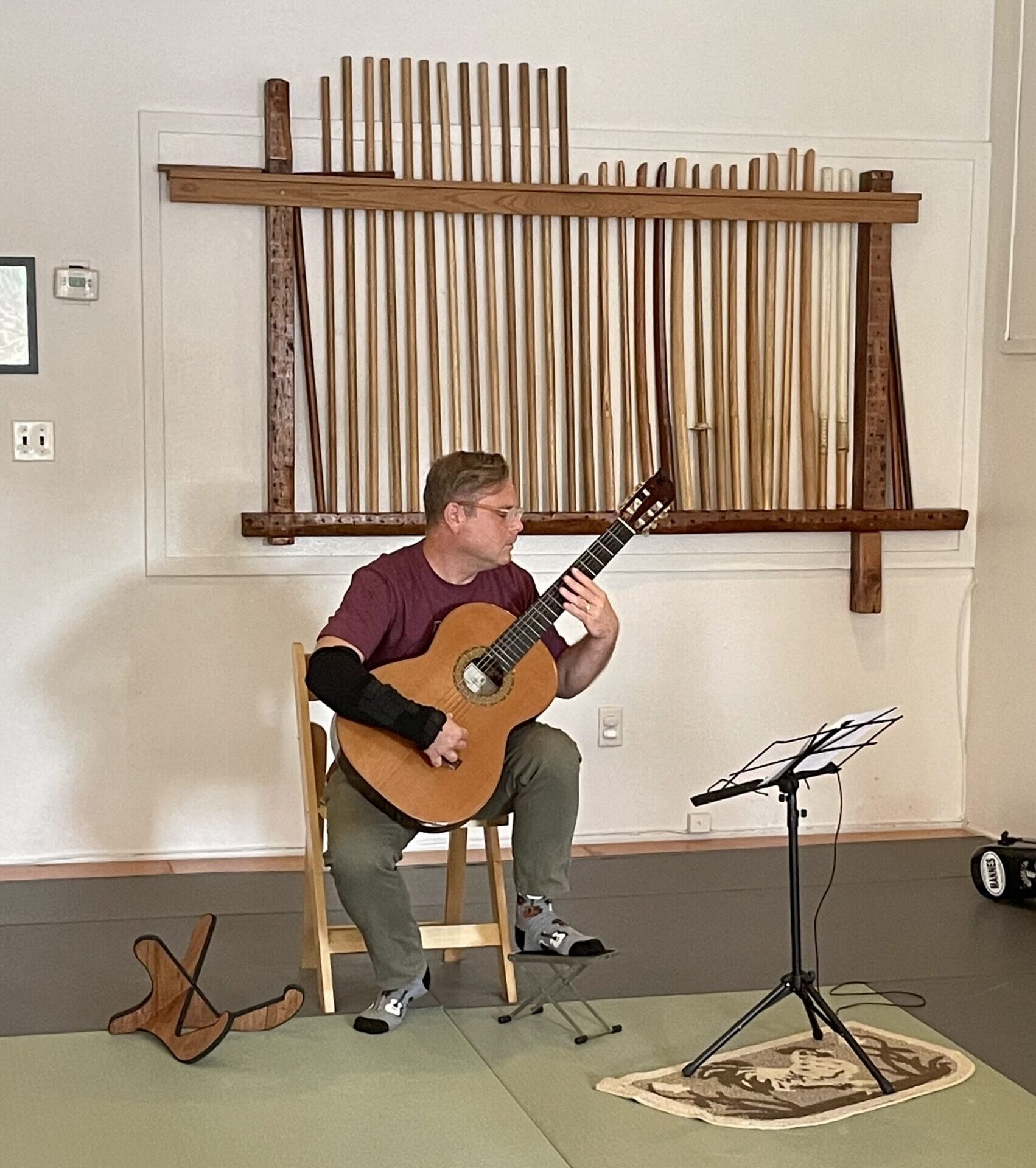 The only way to practice performing is to perform. For me, that means learning to manage the nervousness I experience during every performance. The nervousness is always a surprise, too. I do not consciously expect to be nervous. I’ve performed for years in different contexts and I teach aikido (a martial art). That is, I perform every day, and sometimes for huge audiences. However, performing solo classical guitar is an entirely different experience, and the nervousness bubbles up as soon as my fingers touch the strings.